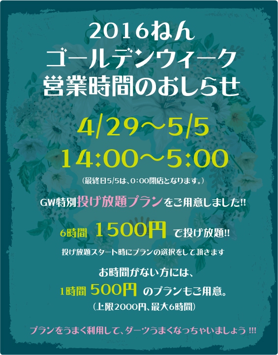 - 2016年ゴールデンウィーク中の営業時間のお知らせ