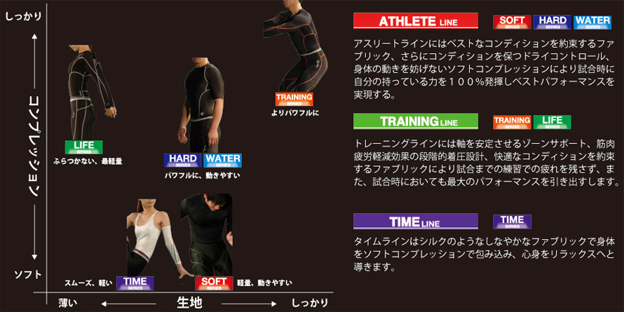 生地に織り込んだチタン金属に特殊な電気加工をする事により、様々なスポーツシーンにおいてプレイヤーをベストパフォーマンスへと導きます。